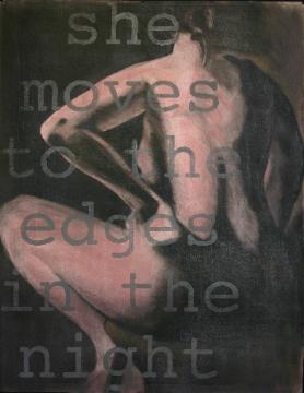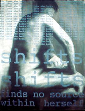 are intended transcend specific age and reveal the constant, internal and evolving self found in the private space of thought, body and the personal. The women’s bodies in each piece are just over life size and can be hung low on the wall to meet the viewer face-to-face. Text is hand drawn or applied using xerox transfer printing. The images include repetitive phrases that read like private thoughts. The viewer is invited to engage in an intense visual dialogue with the woman's sense-of-self in these images. The texts slow down the gaze of the viewer and create a veil of thoughts on the body. The presence of the nude body also becomes a metaphor for the intimacy of self revealed in the text. I have searched for an image that conveyed essential woman, not determined by notions of age or physical beauty. Variations on a simple crouch or squat seemed most compelling. It is a stance of our daily life functions of giving birth, of elimination and of bathing. This simple visual metaphor seems an appropriate starting point for reclaiming images of ourselves. |